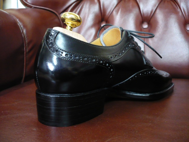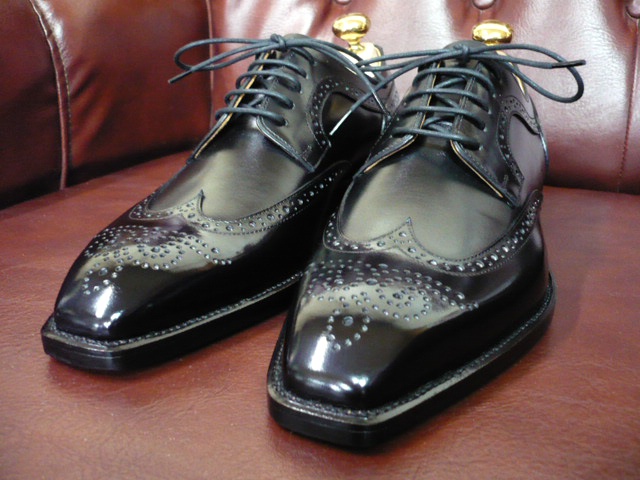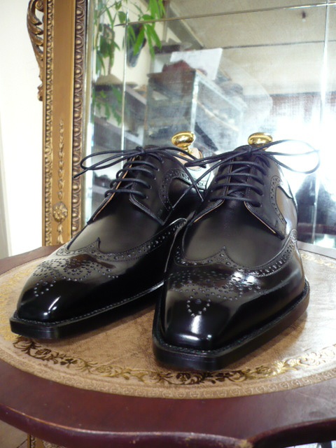 「フルブローグを黒でエレガントに。」というお客様のご要望に応えての1足。デュプイのボックスカーフを使用しています。ハンドソーンウェルテッド、相方・佐渡クン渾身の力作です。