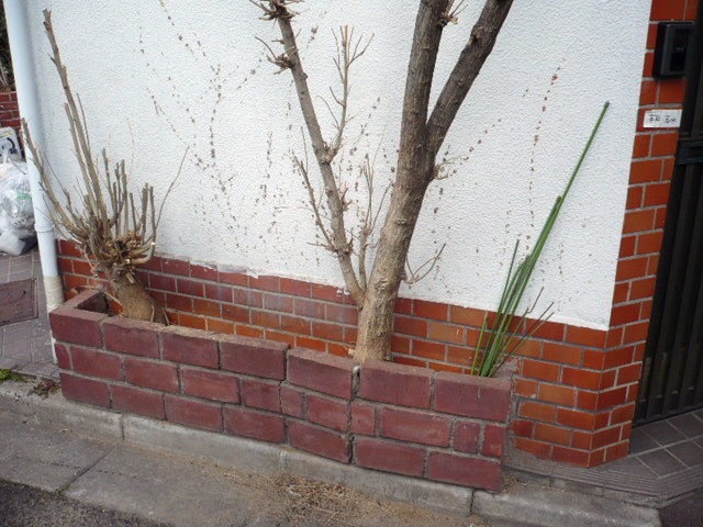 工房前の花壇。こんなに大きな木が。。。根っこに負けて崩壊寸前です。こちらはすでに崩壊。。。レンガは外壁に立てかけているだけの状態。というわけで。大家さんと話した結果、花壇を直しても木が大きくなればまた同じことのくり返しだということで、木を切ってしまうことになりました。残念ですが、仕方ありません。一瞬にして殺風景になってしまいました。。。最初の大きな木もこのとおり。ここを借りて以来、木ありきで花壇をどんな風にしようかとイメージを膨らませていたのですが、またイチから仕切りなおしです。花壇復活後は、つるバラを植える予定なので急がなければ!