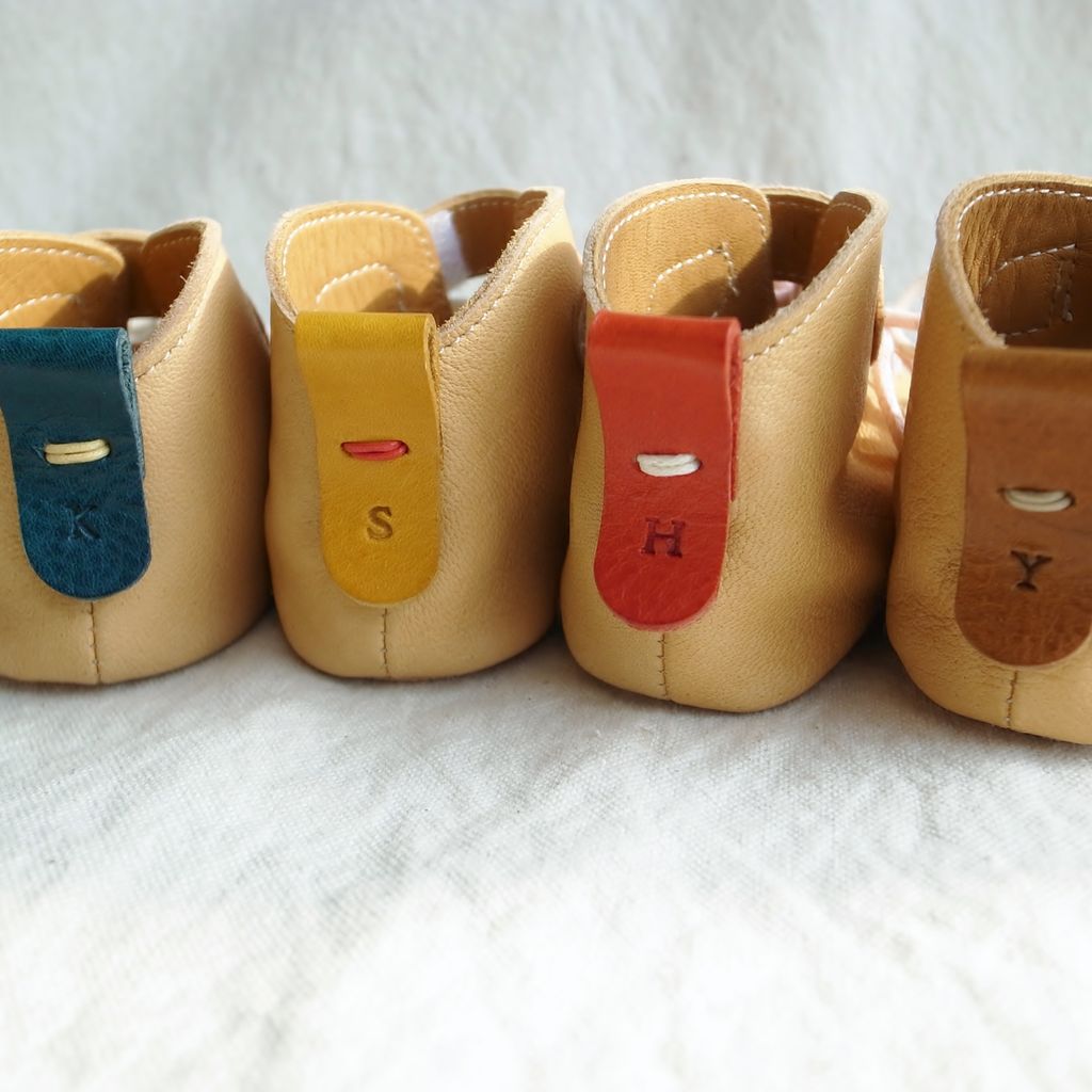 踵の革には人気のあるブルー・イエロー・ブラウンの3色に、新色のレッド を加えました。ご希望があれば画像のように刻印をお入れすることもできます。もちろんご希望がなければ刻印なしでお作りします。